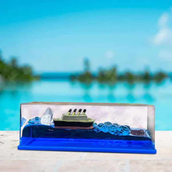 Get ready to set sail with the quirkiest desk companion of the century! The Unsinkable Titanic Cruise Ship isn't just a paperweight; it's a tiny titan of tension relief, a buoyant buddy in your ocean of paperwork. With its insides swirling with a hypnotic blue liquid, a teensy Titanic, and its own personal iceberg, it's like having a blockbuster in a bottle - without the sinking feeling!Â